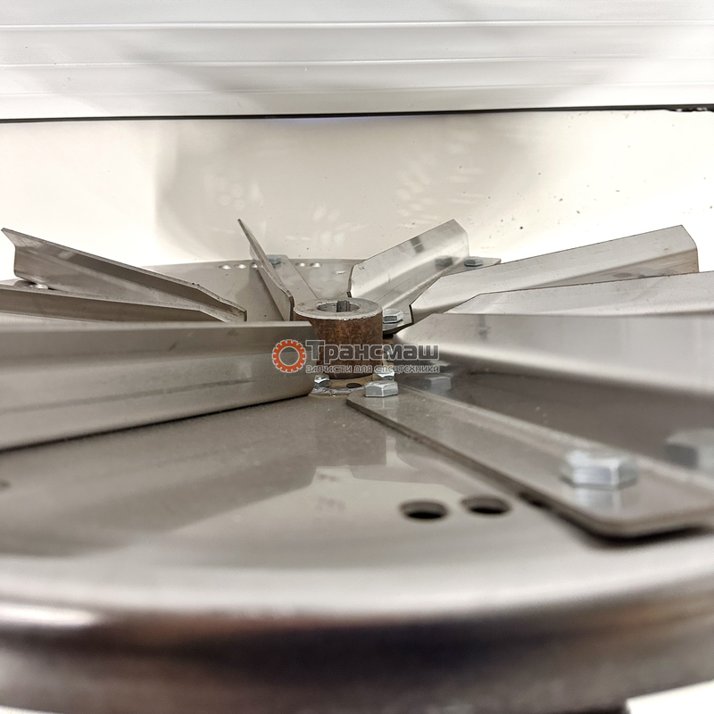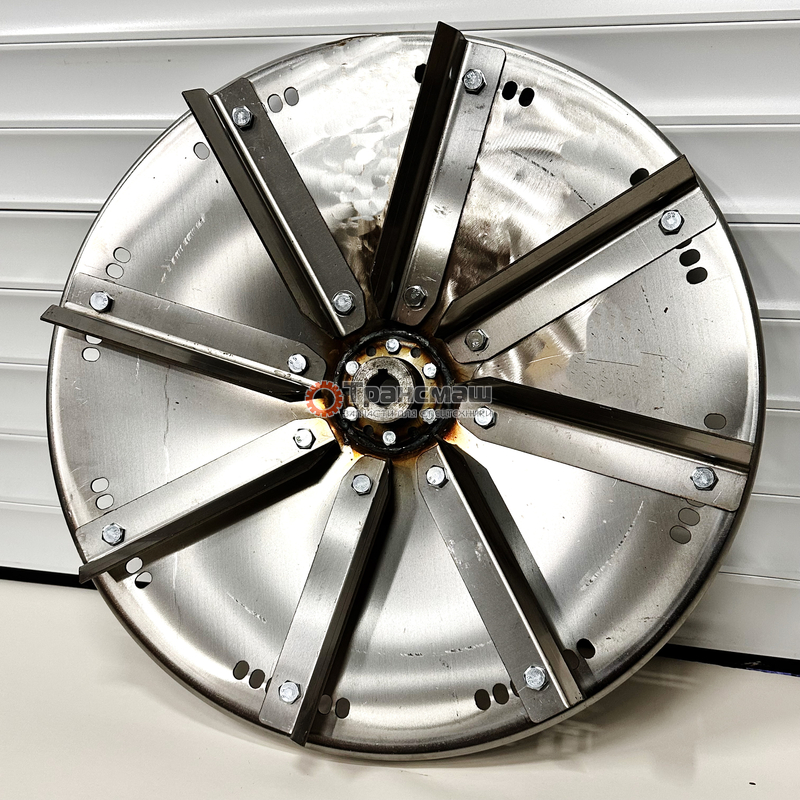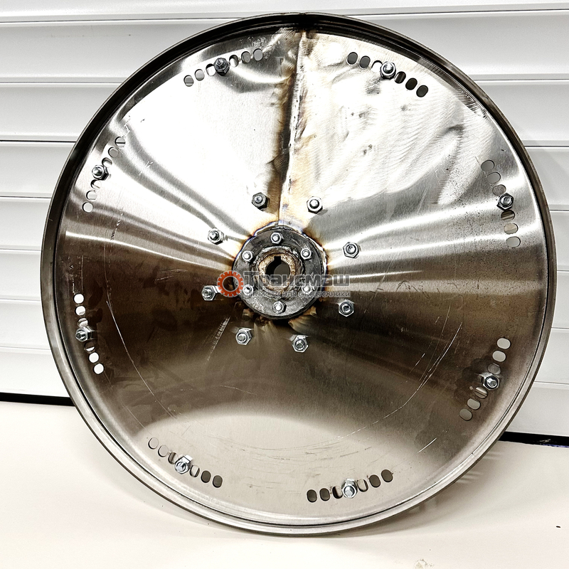 Диск разбрасывающий ПС90 (КДМ) из нержавеющей стали, плоскость диска сферическая, лопатки регулируются в нескольких положениях. Размеры диска: внешний диаметр - 600мм, внутренний диаметр 27мм, шпонка ширина 8мм, высота посадки вала -50мм.